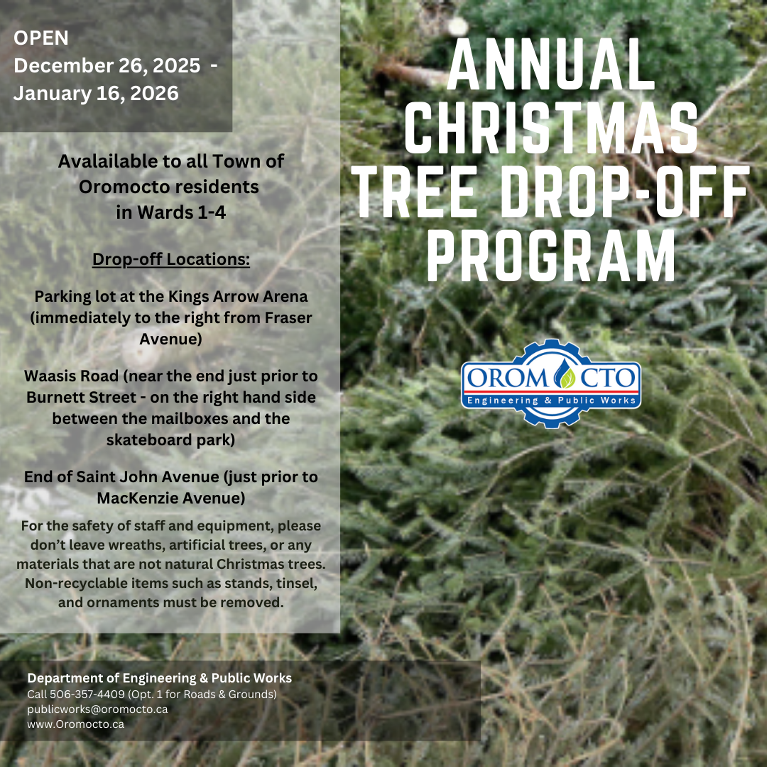 The Town of Oromocto’s annual Christmas Tree Recycling program typically runs for three (3) weeks starting on Boxing Day. This is a no-cost service available to Town residents.
