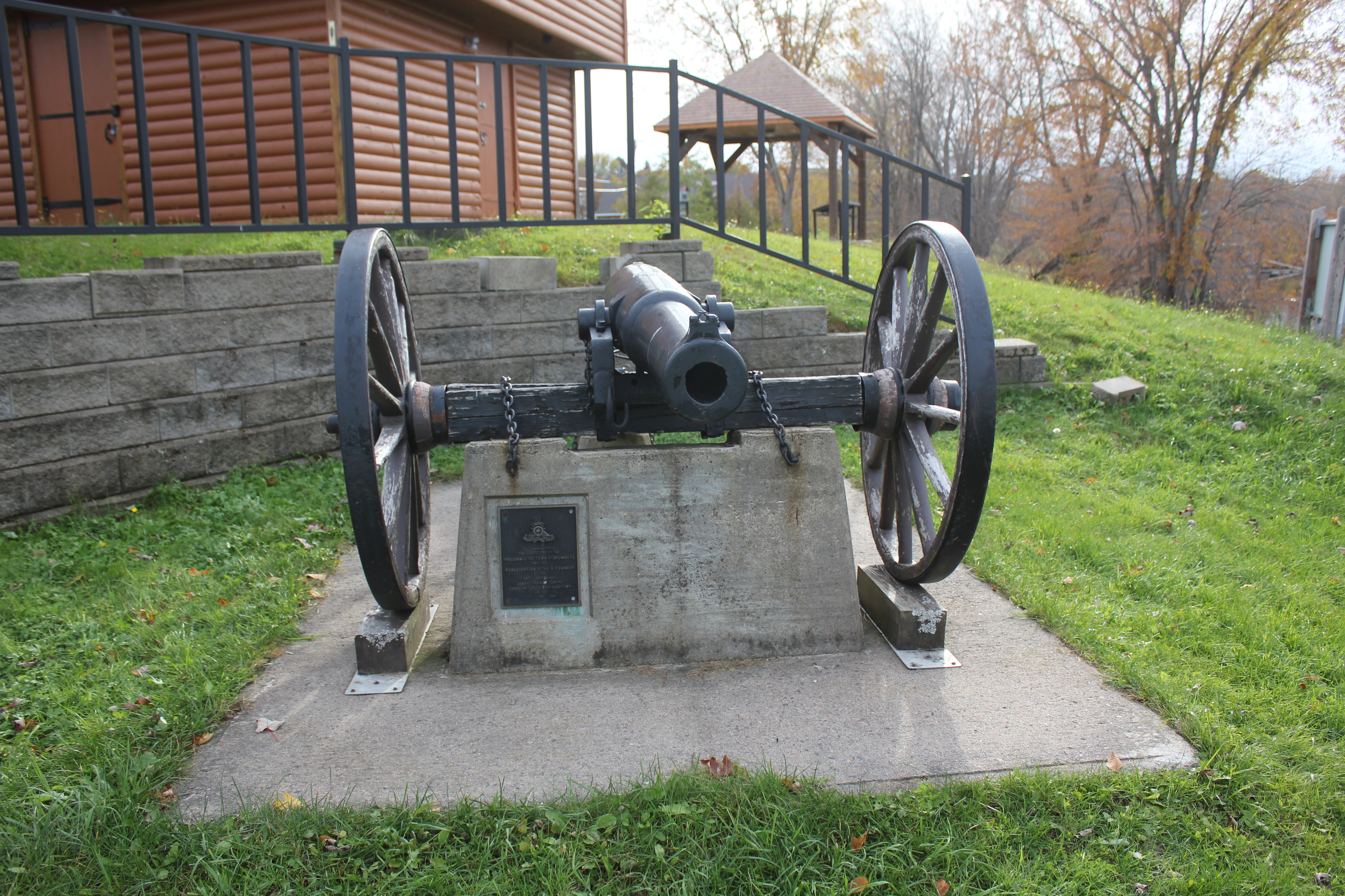 This cannon was placed to commemorate the exercising of the Freedom of the Town and the rededication of the 9 pounder by the Artillery School, Combat Training Centre, Base Gagetown on the 27 June 1984.